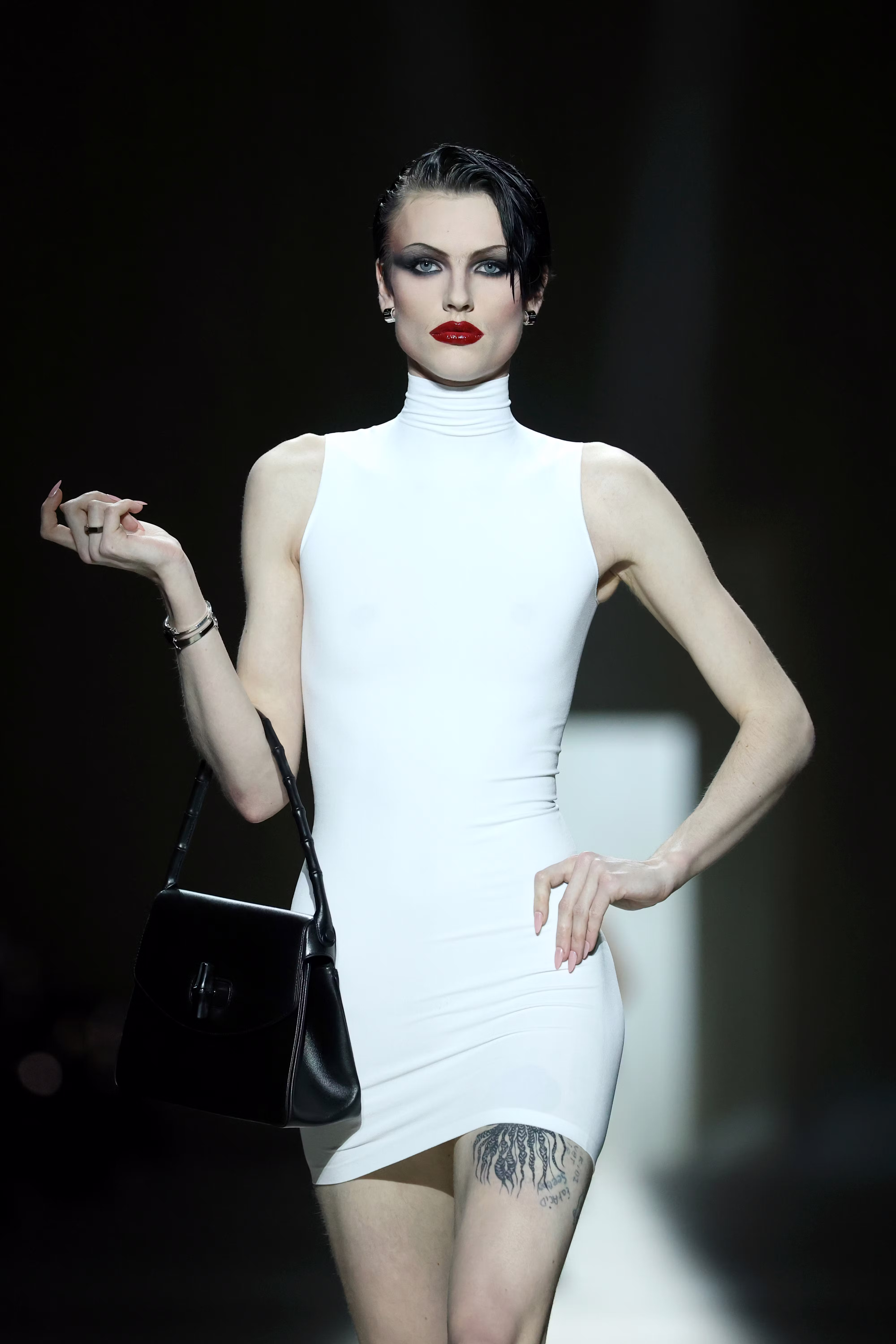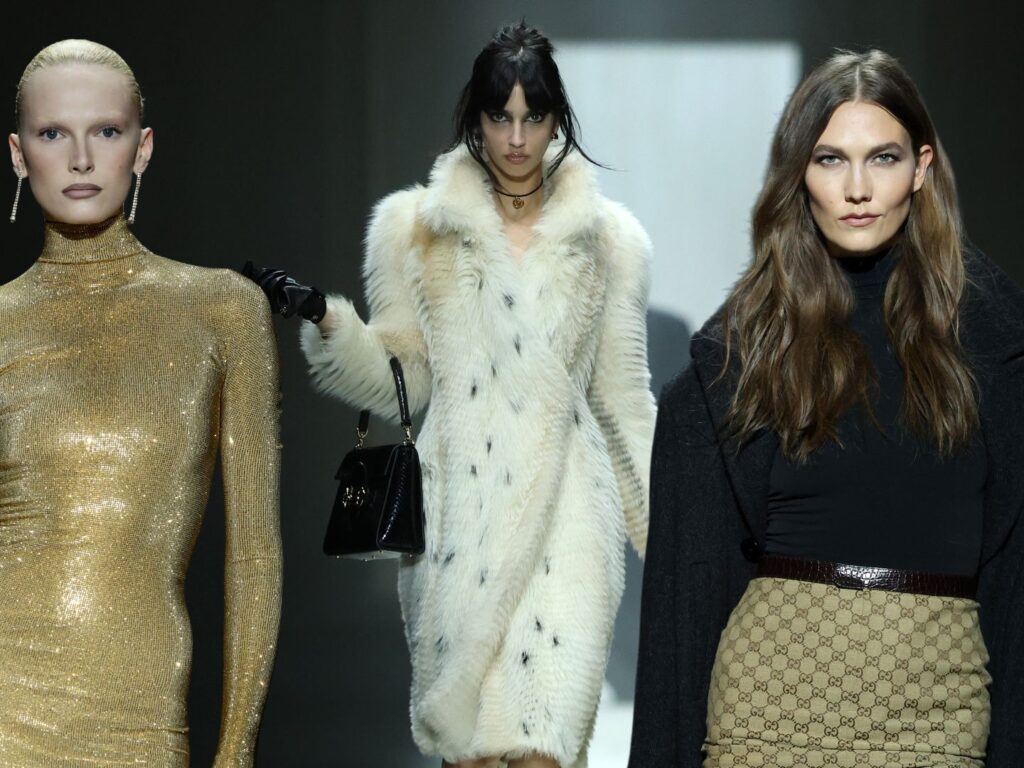 This season, the models reportedly represented a variety of Gucci archetypes, from monogram-crazed fanny-wearing f-ckboys to wealthy socialites in mini-dresses and everything in between. The collection also featured Demna’s first Gucci sneaker, dubbed the Manhattan, paired with classic loafers, sleek heels, and the new Gucci Bamboo 1947. Echoing the brand’s inimitable Tom Ford era , the show closed with Kate Moss appearing in a backless gown that revealed a white gold GG thong.